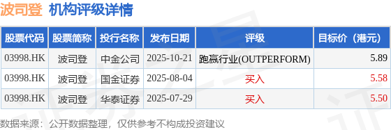 投行对该股的评级以买入为主,近90天内共有2家投行给出买入评级,近90天的目标均价为5.66港元。中金公司最新一份研报给予波司登跑赢行业(OUTPERFORM)评级,目标价5.89港元。