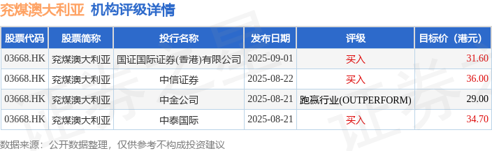 投行对该股的评级以买入为主,近90天内共有3家投行给出买入评级,近90天的目标均价为32.83港元。国证国际证券(香港)有限公司最新一份研报给予兖煤澳大利亚买入评级,目标价31.6港元。