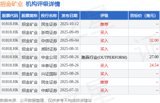 投行对该股的评级以买入为主,近90天内共有6家投行给出买入评级,近90天的目标均价为27.85港元。民生证券最新一份研报给予招金矿业推荐评级。