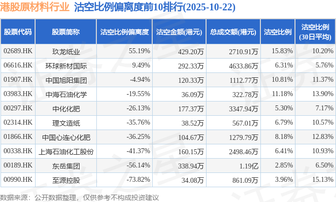 从沽空比例偏离度来看,玖龙纸业、环球新材国际、中国旭阳集团沽空比例偏离度位居行业前三,分别为55.19%、9.49%、-4.94%。