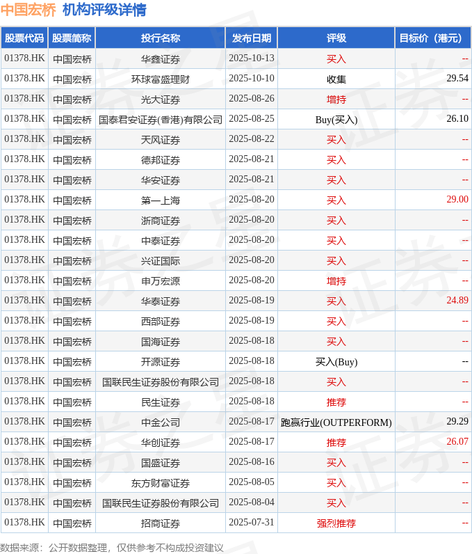 投行对该股的评级以买入为主,近90天内共有15家投行给出买入评级,近90天的目标均价为27.48港元。华鑫证券最新一份研报给予中国宏桥买入评级。