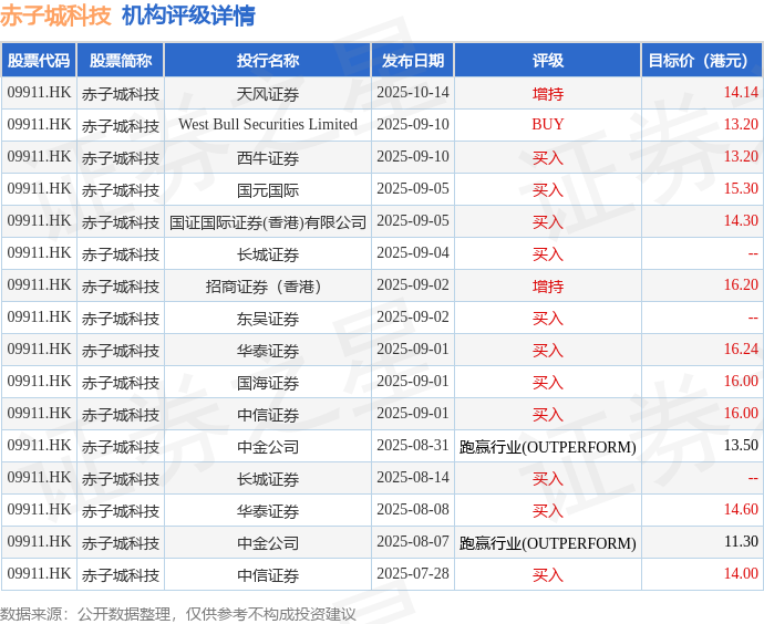 截至2025年10月23日收盘,赤子城科技(09911.HK)报收于11.15港元,下跌3.55%,成交量389.81万股,成交额4341.71万港元。投行对该股的评级以买入为主,近90天内共有11家投行给出买入评级,近90天的目标均价为14.46港元。天风证券最新一份研报给予赤子城科技增持评级,目标价14.14港元。