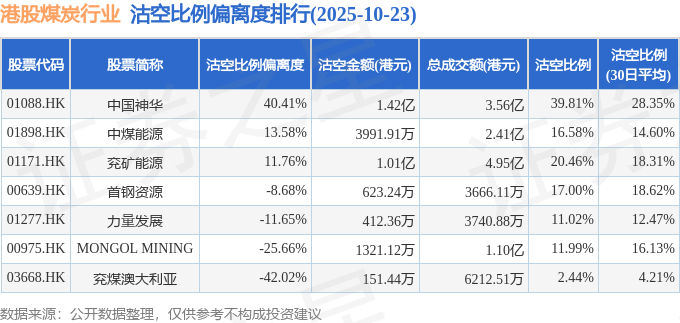 从沽空比例偏离度来看,中国神华、中煤能源、兖矿能源沽空比例偏离度位居行业前三,分别为40.41%、13.58%、11.76%。