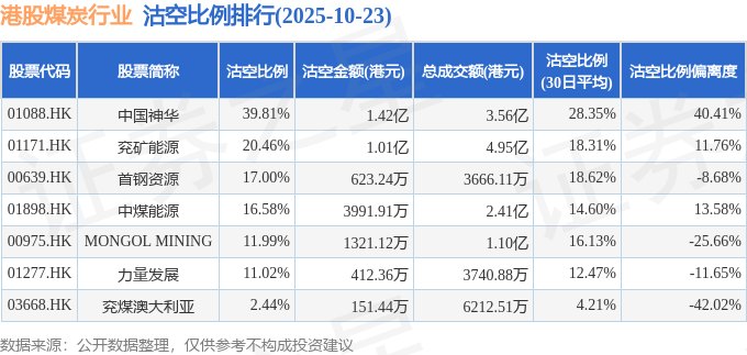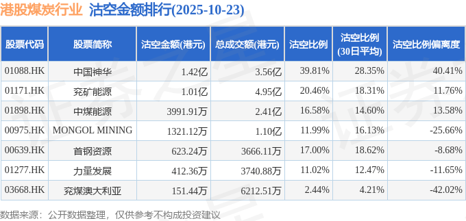从沽空金额来看,中国神华、兖矿能源、中煤能源沽空金额位居行业前三,分别为1.42亿港元、1.01亿港元、3991.91万港元。
