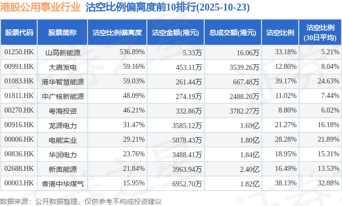 从沽空比例偏离度来看,山高新能源、大唐发电、港华智慧能源沽空比例偏离度位居行业前三,分别为536.89%、59.16%、59.03%。