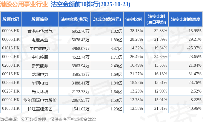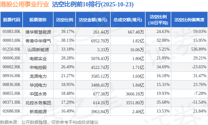 从沽空比例来看,港华智慧能源、香港中华煤气、山高新能源沽空比例位居行业前三,分别为39.17%、38.13%、33.18%。