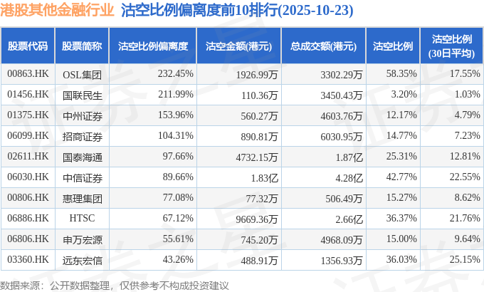 从沽空比例偏离度来看,OSL集团、国联民生、中州证券沽空比例偏离度位居行业前三,分别为232.45%、211.99%、153.96%。
