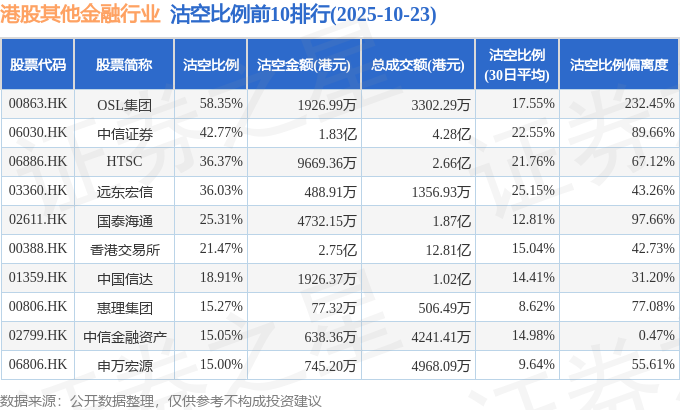 由于港股人民币柜台交易股票成交金额较小,沽空比例普遍偏高,为了避免干扰,已将人民币柜台交易股票从排行表格中剔除。