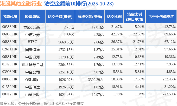 从沽空金额来看,香港交易所、中信证券、HTSC沽空金额位居行业前三,分别为2.75亿港元、1.83亿港元、9669.36万港元。