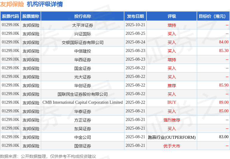 截至2025年10月23日收盘,友邦保险(01299.HK)报收于70.9港元,上涨0.5%,成交量1860.51万股,成交额13.19亿港元。投行对该股的评级以买入为主,近90天内共有8家投行给出买入评级,近90天的目标均价为85.37港元。太平洋证券最新一份研报给予友邦保险增持评级。