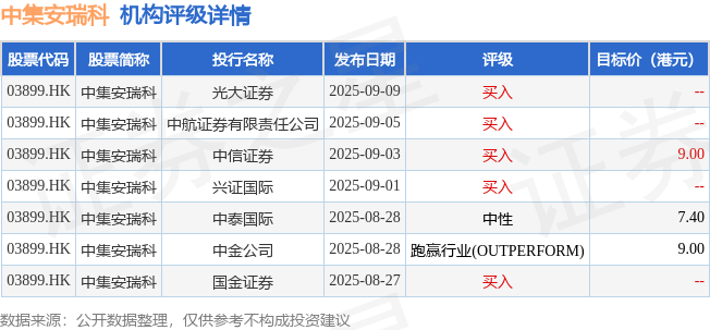 截至2025年10月23日收盘,中集安瑞科(03899.HK)报收于7.92港元,上涨0.51%,成交量230.2万股,成交额1798.11万港元。投行对该股的评级以买入为主,近90天内共有5家投行给出买入评级,近90天的目标均价为8.47港元。光大证券最新一份研报给予中集安瑞科买入评级。