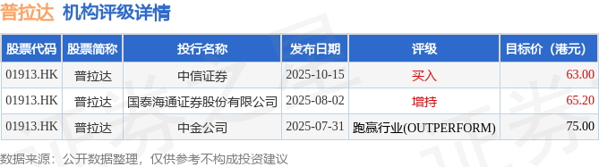 截至2025年10月23日收盘,普拉达(01913.HK)报收于46.3港元,下跌0.86%,成交量304.28万股,成交额1.4亿港元。投行对该股的评级以跑赢行业(OUTPERFORM)为主,近90天内共有1家投行给出跑赢行业(OUTPERFORM)评级,近90天的目标均价为67.73港元。中信证券最新一份研报给予普拉达买入评级,目标价63港元。