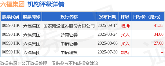 投行对该股的评级以增持为主,近90天内共有2家投行给出增持评级,近90天的目标均价为34.12港元。国泰海通证券股份有限公司最新一份研报给予六福集团增持评级,目标价41.35港元。