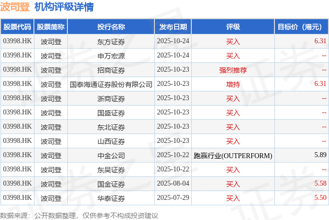 截至2025年10月24日收盘,波司登(03998.HK)报收于4.96港元,上涨0.81%,成交量3370.49万股,成交额1.66亿港元。投行对该股的评级以买入为主,近90天内共有9家投行给出买入评级,近90天的目标均价为5.92港元。东方证券最新一份研报给予波司登买入评级,目标价6.31港元。