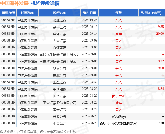 截至2025年10月24日收盘,中国海外发展(00688.HK)报收于13.74港元,下跌0.72%,成交量1626.22万股,成交额2.24亿港元。投行对该股的评级以买入为主,近90天内共有10家投行给出买入评级,近90天的目标均价为18.95港元。财通证券最新一份研报给予中国海外发展买入评级。