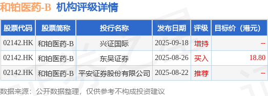 投行对该股的评级以推荐为主,近90天内共有1家投行给出推荐评级,近90天的目标均价为18.8港元。兴证国际最新一份研报给予和铂医药-B增持评级。