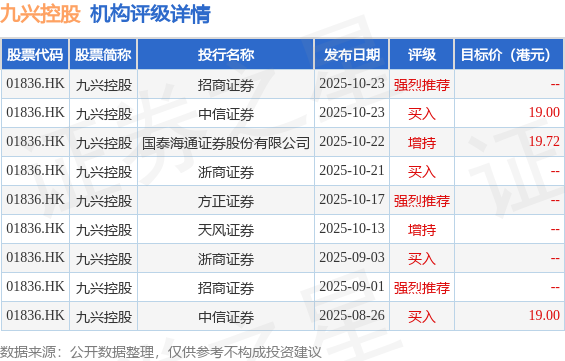 截至2025年10月27日收盘,九兴控股(01836.HK)报收于16.5港元,上涨1.04%,成交量114.89万股,成交额1907.89万港元。投行对该股的评级以买入为主,近90天内共有4家投行给出买入评级,近90天的目标均价为19.24港元。招商证券最新一份研报给予九兴控股强烈推荐评级。