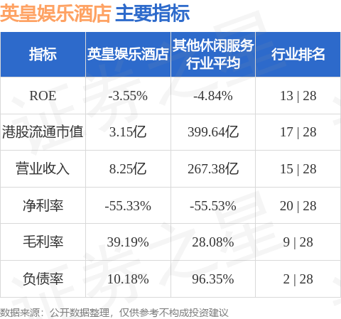 英皇娱乐酒店港股市值3.15亿港元,在其他休闲服务行业中排名第17。主要指标见下表: