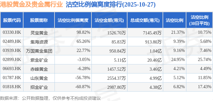 从沽空比例来看,紫金矿业、灵宝黄金、集海资源沽空比例位居行业前三,分别为24.95%、21.37%、9.39%。
