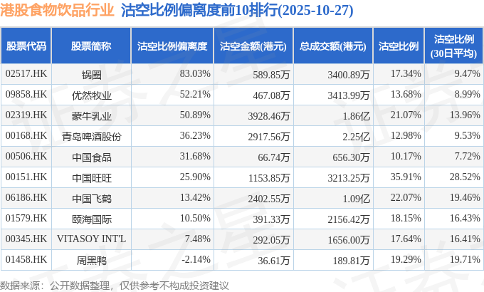 从沽空比例偏离度来看,锅圈、优然牧业、蒙牛乳业沽空比例偏离度位居行业前三,分别为83.03%、52.21%、50.89%。