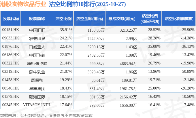 从沽空比例来看,中国旺旺、农夫山泉、百威亚太沽空比例位居行业前三,分别为35.91%、24.21%、22.41%。