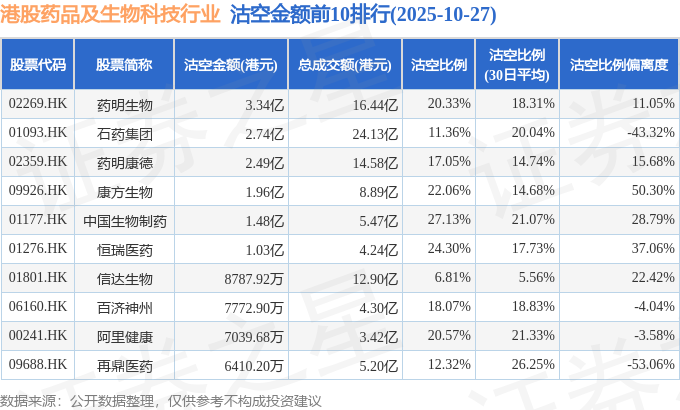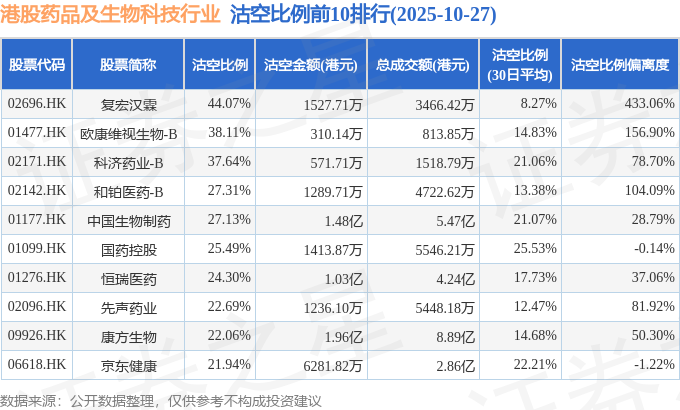 从沽空比例偏离度来看,复宏汉霖、凯莱英、同源康医药-B沽空比例偏离度位居行业前三,分别为433.06%、277.25%、235.34%。