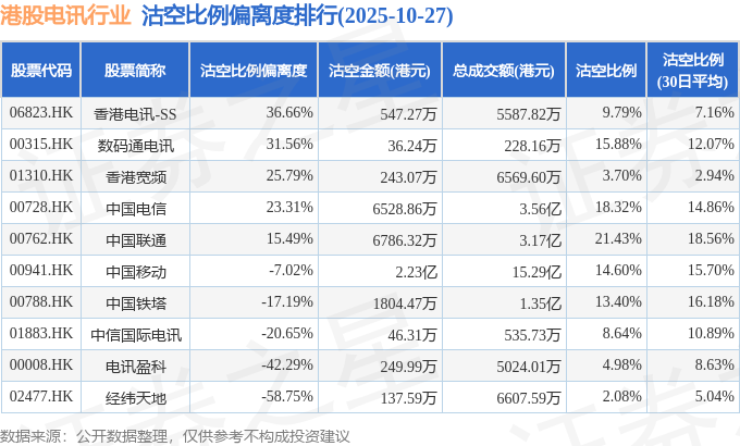 从沽空比例偏离度来看,香港电讯-SS、数码通电讯、香港宽频沽空比例偏离度位居行业前三,分别为36.66%、31.56%、25.79%。
