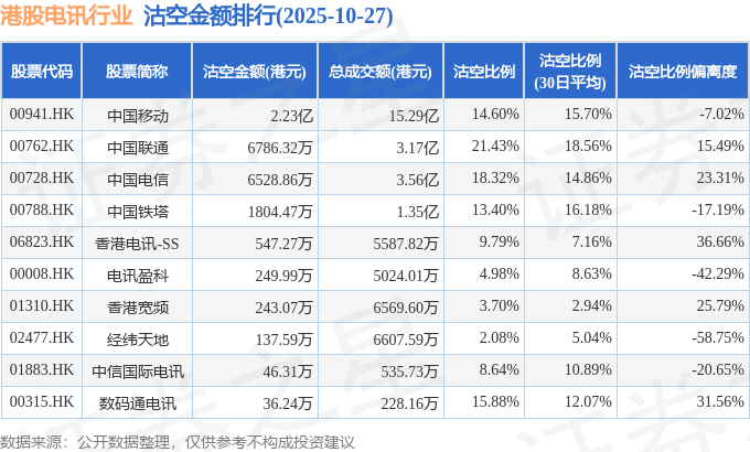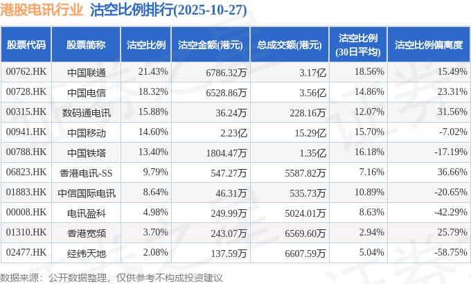 从沽空比例来看,中国联通、中国电信、数码通电讯沽空比例位居行业前三,分别为21.43%、18.32%、15.88%。