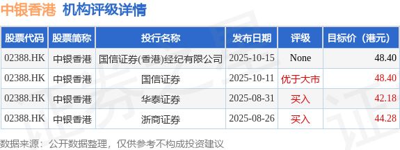 截至2025年10月28日收盘,中银香港(02388.HK)报收于38.48港元,上涨1.32%,成交量2140.13万股,成交额8.25亿港元。投行对该股的评级以买入为主,近90天内共有2家投行给出买入评级,近90天的目标均价为45.82港元。国信证券(香港)经纪有限公司最新一份研报给予中银香港None评级,目标价48.4港元。