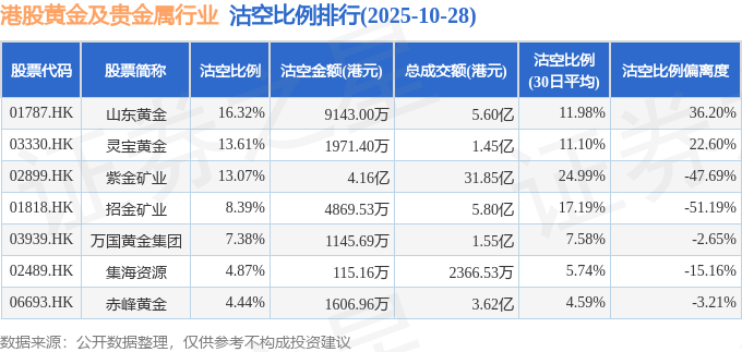 从沽空比例来看,山东黄金、灵宝黄金、紫金矿业沽空比例位居行业前三,分别为16.32%、13.61%、13.07%。