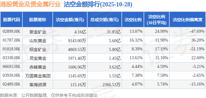 从沽空金额来看,紫金矿业、山东黄金、招金矿业沽空金额位居行业前三,分别为4.16亿港元、9143万港元、4869.53万港元。