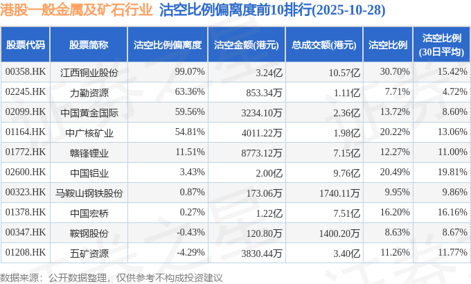 从沽空比例来看,江西铜业股份、中国铝业、中广核矿业沽空比例位居行业前三,分别为30.7%、20.49%、20.22%。