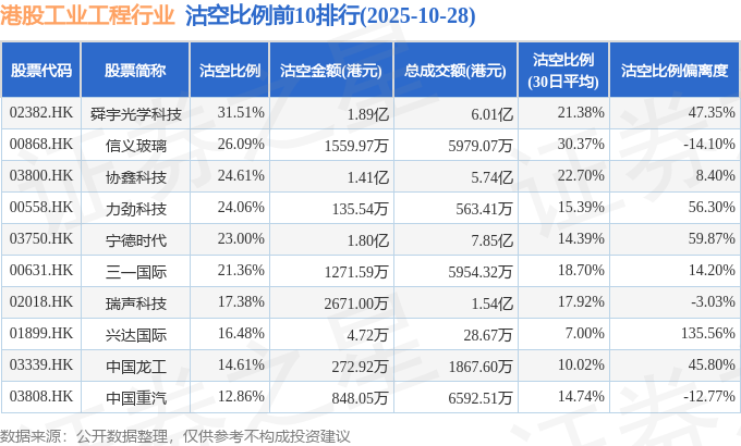从沽空比例来看,舜宇光学科技、信义玻璃、协鑫科技沽空比例位居行业前三,分别为31.51%、26.09%、24.61%。