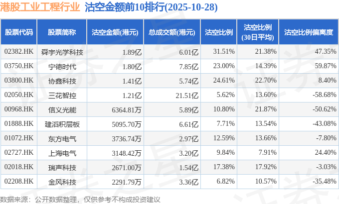 从沽空金额来看,舜宇光学科技、宁德时代、协鑫科技沽空金额位居行业前三,分别为1.89亿港元、1.8亿港元、1.41亿港元。