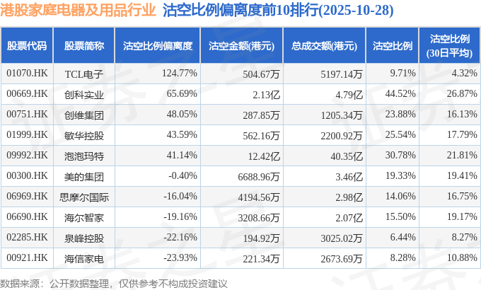从沽空金额来看,泡泡玛特、创科实业、美的集团沽空金额位居行业前三,分别为12.42亿港元、2.13亿港元、6688.96万港元。