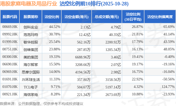 从沽空比例来看,创科实业、泡泡玛特、敏华控股沽空比例位居行业前三,分别为44.52%、30.78%、25.54%。