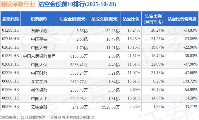 从沽空金额来看,友邦保险、中国平安、中国人寿沽空金额位居行业前三,分别为5.56亿港元、2.68亿港元、1.7亿港元。
