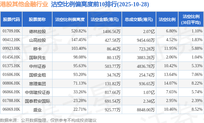 从沽空比例偏离度来看,德林控股、山高控股、移卡沽空比例偏离度位居行业前三,分别为520.82%、147.45%、103.4%。