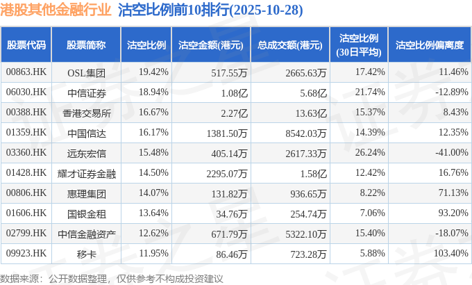 从沽空比例来看,OSL集团、中信证券、香港交易所沽空比例位居行业前三,分别为19.42%、18.94%、16.67%。