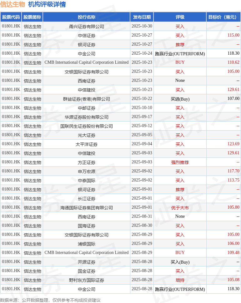 截至2025年10月30日收盘,信达生物(01801.HK)报收于80.7港元,下跌4.61%,成交量3355.13万股,成交额27.05亿港元。投行对该股的评级以买入为主,近90天内共有17家投行给出买入评级,近90天的目标均价为113.75港元。甬兴证券有限公司最新一份研报给予信达生物买入评级。