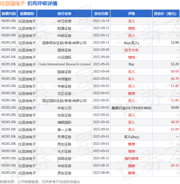 截至2025年10月30日收盘,比亚迪电子(00285.HK)报收于37.42港元,下跌2.65%,成交量3278.28万股,成交额12.38亿港元。投行对该股的评级以买入为主,近90天内共有9家投行给出买入评级,近90天的目标均价为54.58港元。申万宏源最新一份研报给予比亚迪电子买入评级。