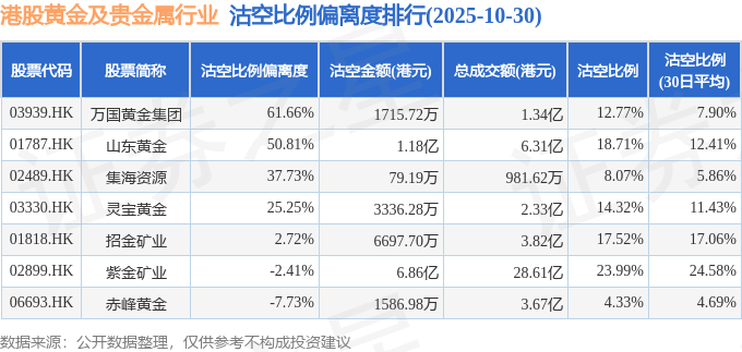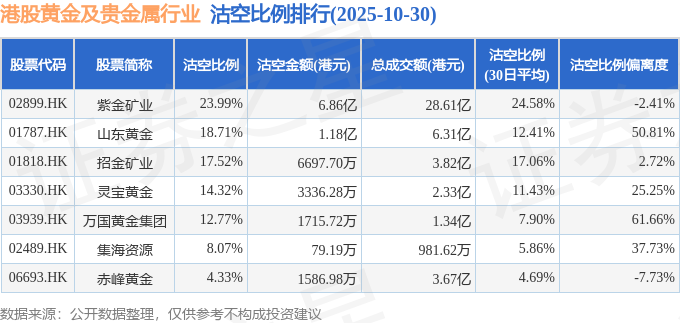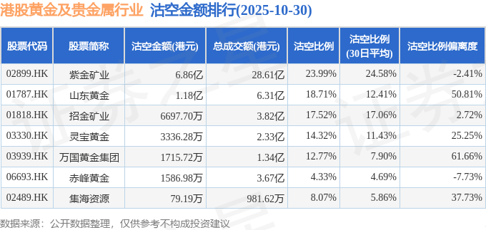 从沽空金额来看,紫金矿业、山东黄金、招金矿业沽空金额位居行业前三,分别为6.86亿港元、1.18亿港元、6697.7万港元。