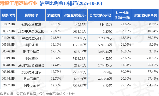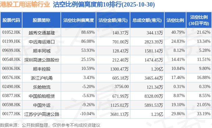 从沽空比例偏离度来看,越秀交通基建、中远海运港口、顺丰同城沽空比例偏离度位居行业前三,分别为88.69%、86.08%、53.93%。