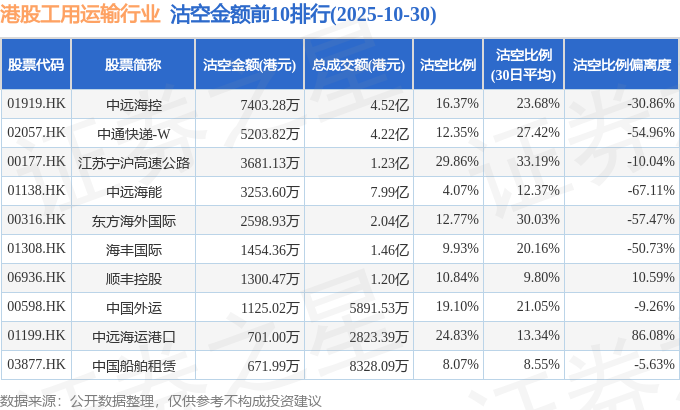 从沽空金额来看,中远海控、中通快递-W、江苏宁沪高速公路沽空金额位居行业前三,分别为7403.28万港元、5203.82万港元、3681.13万港元。