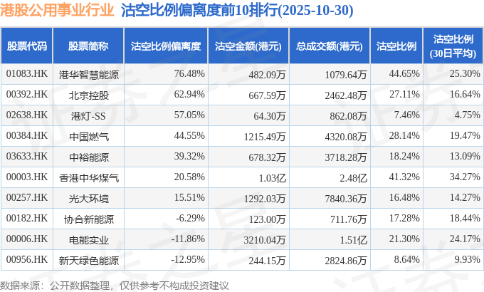 从沽空比例偏离度来看,港华智慧能源、北京控股、港灯-SS沽空比例偏离度位居行业前三,分别为76.48%、62.94%、57.05%。