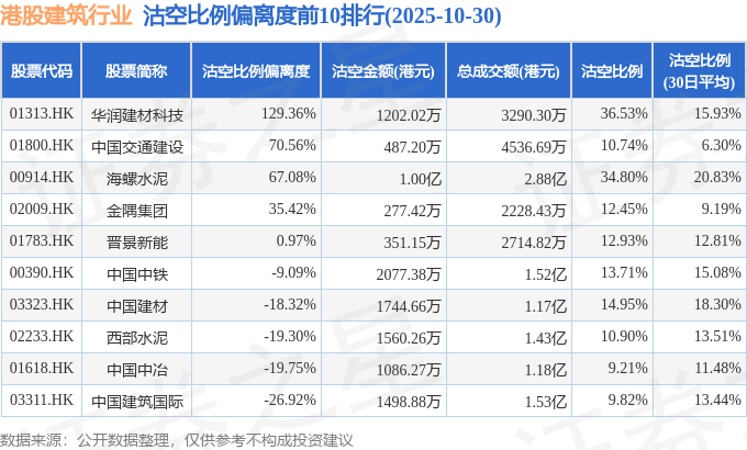 从沽空比例偏离度来看,华润建材科技、中国交通建设、海螺水泥沽空比例偏离度位居行业前三,分别为129.36%、70.56%、67.08%。