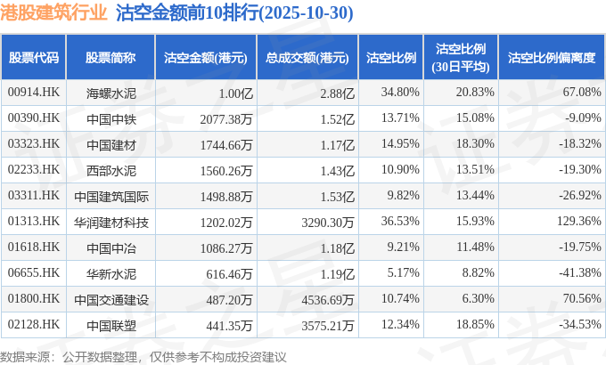 从沽空金额来看,海螺水泥、中国中铁、中国建材沽空金额位居行业前三,分别为1亿港元、2077.38万港元、1744.66万港元。