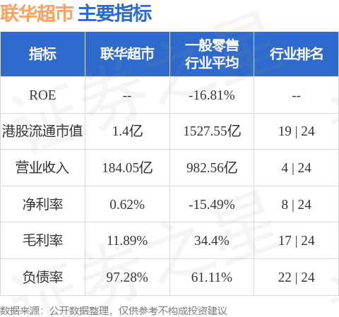 联华超市港股市值1.4亿港元,在一般零售行业中排名第19。主要指标见下表: