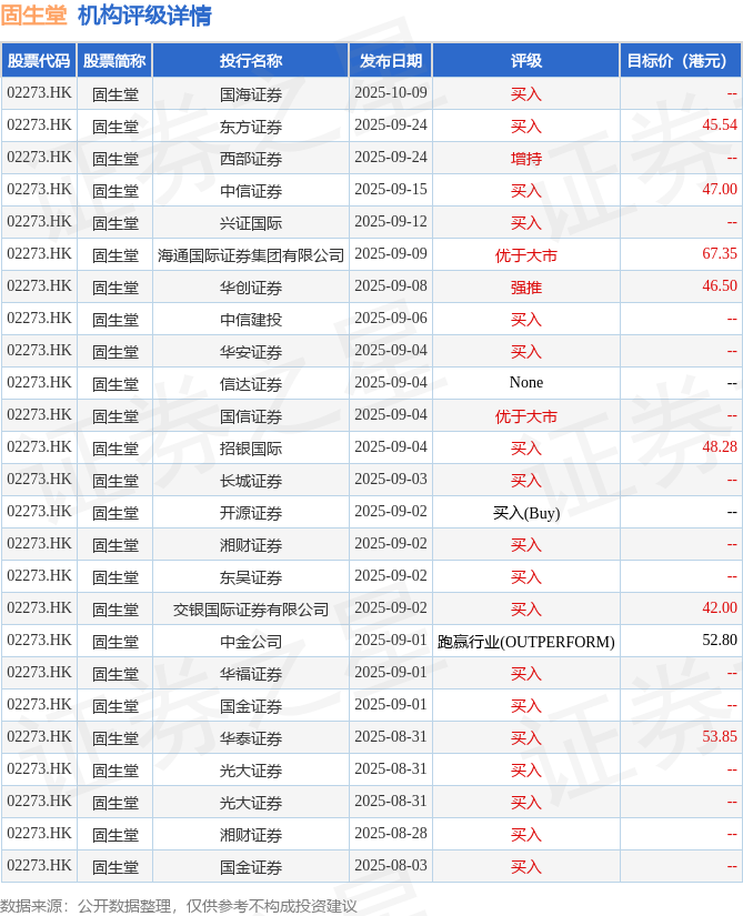 截至2025年10月30日收盘,固生堂(02273.HK)报收于28.54港元,下跌2.33%,成交量241.86万股,成交额6921.3万港元。投行对该股的评级以买入为主,近90天内共有18家投行给出买入评级,近90天的目标均价为50.42港元。国海证券最新一份研报给予固生堂买入评级。