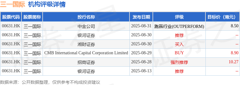 截至2025年10月30日收盘,三一国际(00631.HK)报收于7.64港元,下跌0.13%,成交量504.27万股,成交额3850.77万港元。投行对该股的评级以推荐为主,近90天内共有2家投行给出推荐评级,近90天的目标均价为9.22港元。中金公司最新一份研报给予三一国际跑赢行业(OUTPERFORM)评级,目标价8.5港元。